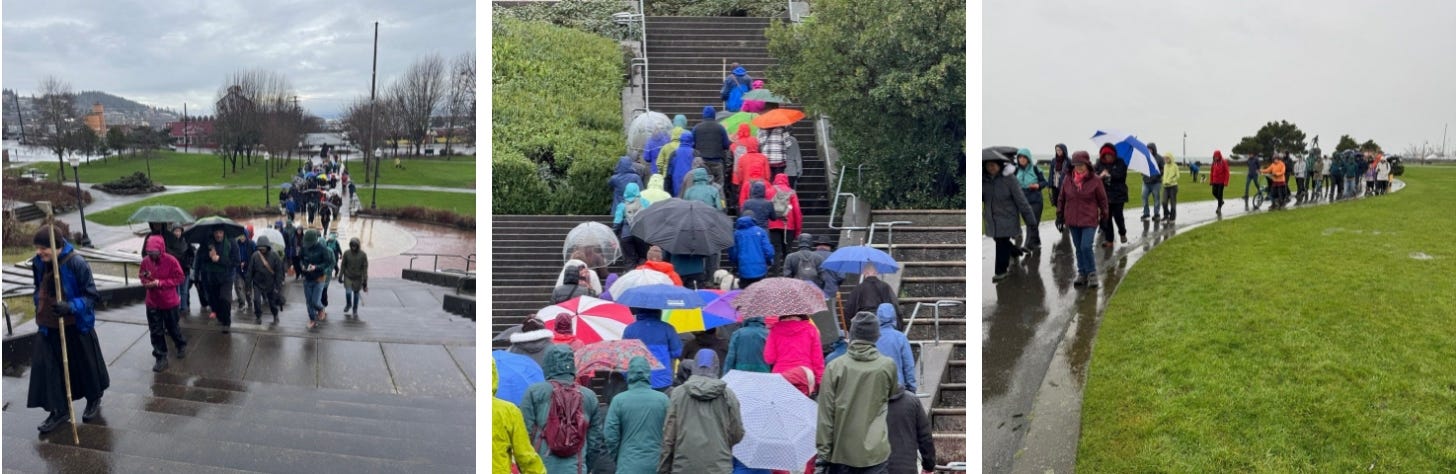 Our recent Peace Walk in Bellingham was deeply beautiful—rain-soaked, quiet, and unexpectedly powerful. About 75 people gathered at a small waterfront park and walked about three miles into the city center, passing beneath Bellingham’s Arch of Reconciliation, which honors the municipality’s past harms, before the group returned to the park. Many likely heard about the walk through outreach to local organizations such as Indivisible Bellingham and Bellingham Troublemakers.